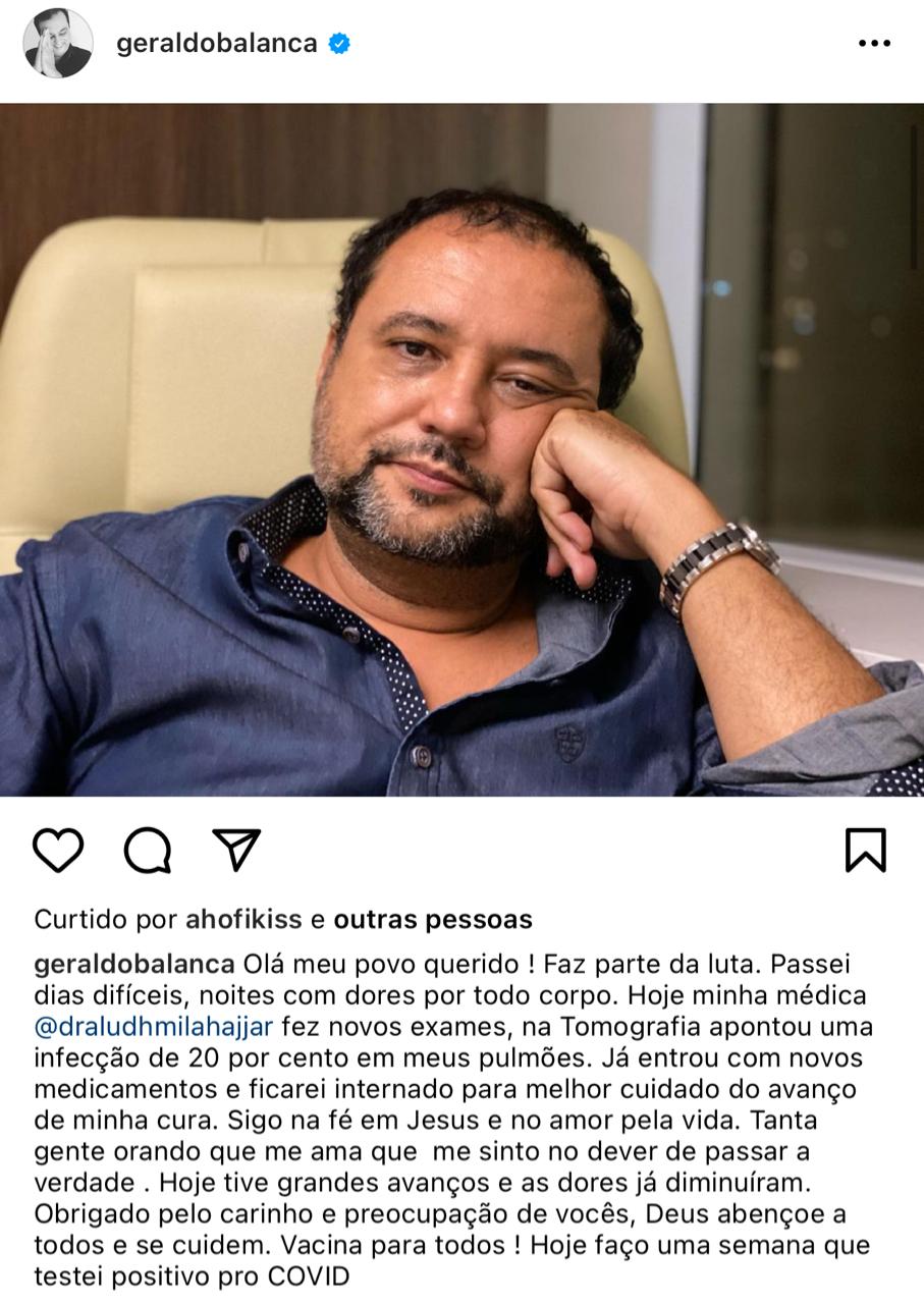 "Olá meu povo querido! Faz parte da luta. Passei dias difíceis, noites com dores por todo corpo. Hoje minha médica fez novos exames, na Tomografia apontou uma infecção de 20 por cento em meus pulmões. Já entrou com novos medicamentos e ficarei internado para melhor cuidado do avanço de minha cura" escreveu o apresentador em uma rede social.