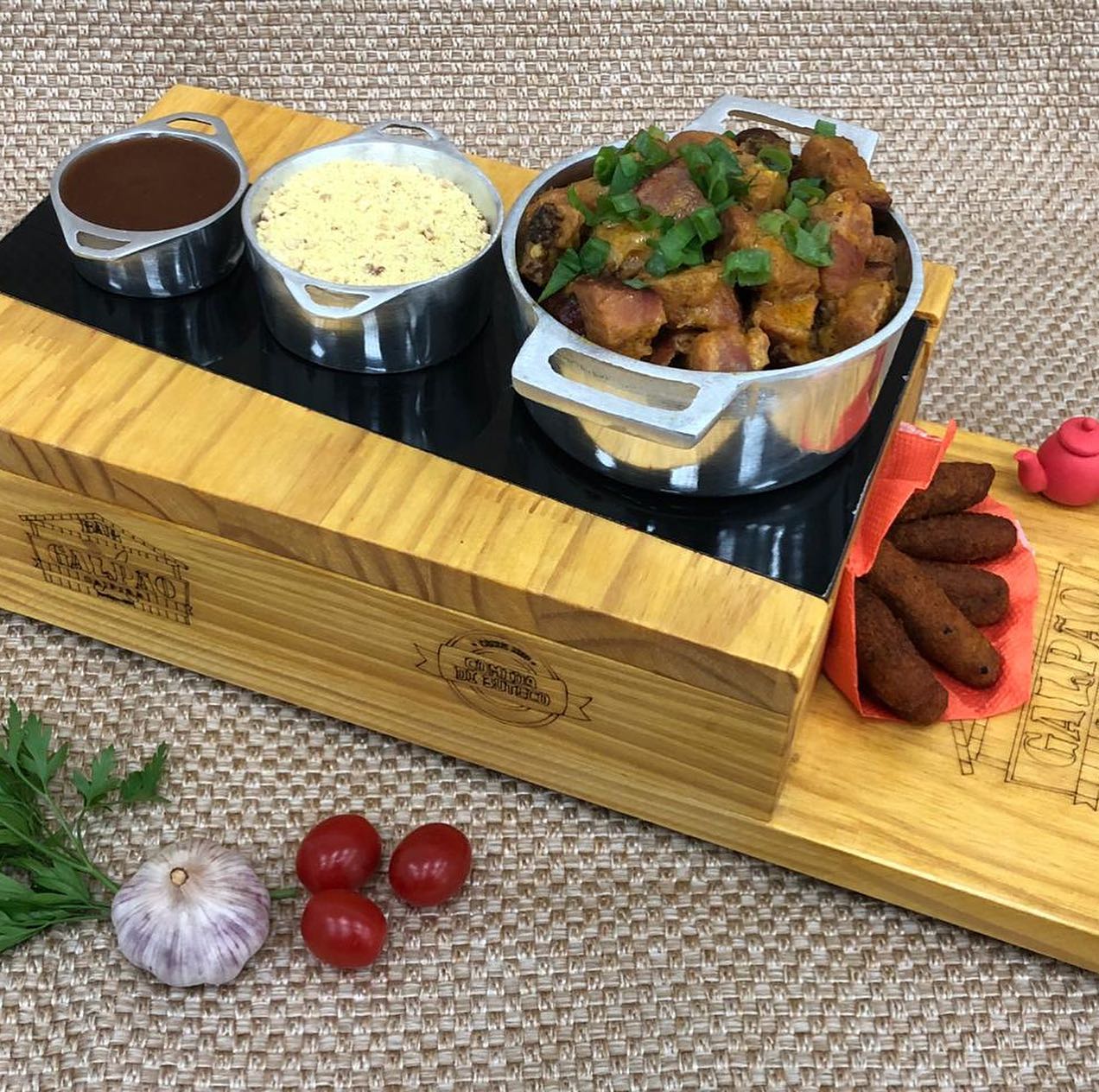 Prato do Bar Galpão. Copa lombo defumada ao molho da casa com queijo, bolinhos de abóbora com calabresa, molho picante de rapadura e farofa de amendoim. Foto: reprodução/ Facebook