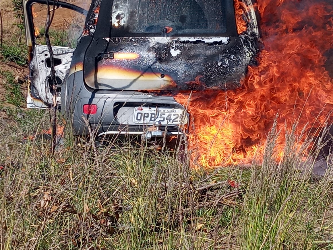 O veículo, Fiat Uno, que sofreu danos severos, incendiou-se e foi consumido pelas chamas. As guarnições extinguiram o fogo, eliminando o risco de explosão e propagação do incêndio.