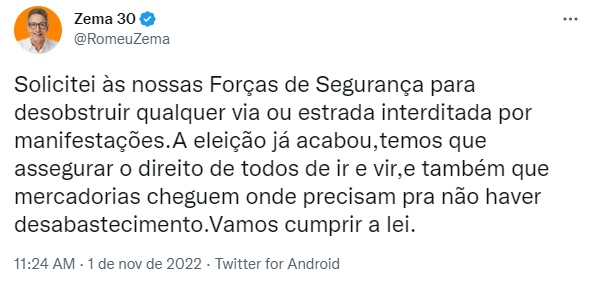 Na manhã desta terça-feira (1), o governador de Minas Gerais, Romeu Zema (NOVO), autorizou as forças de segurança estaduais a cumprir a decisão do STF em desobstruir as rodovias bloqueadas pelos caminhoneiros manifestantes.
