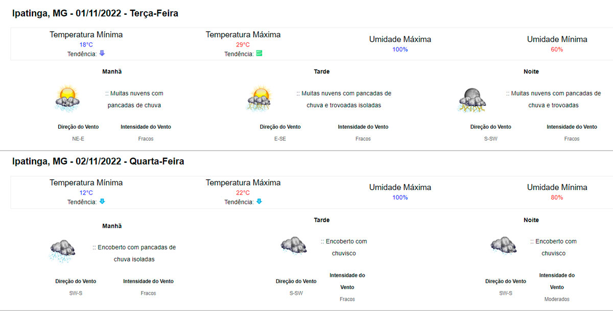 Segundo informações do Instituto Nacional de Meteorologia (Inmet), para Ipatinga, principal cidade do Vale do Aço, a previsão é de temperatura variando entre a mínima de 12ºC e a máxima de 22ºC.