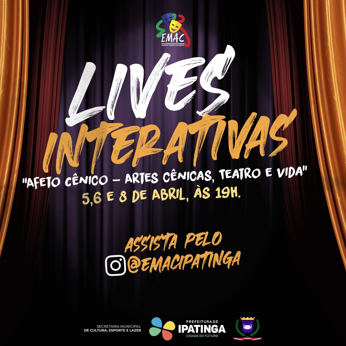 A Semcel – Secretaria Municipal de Cultura, Esporte e Lazer da Prefeitura Municipal de Ipatinga-MG informa que irá realizar ‘lives’ nos dias 5, 6 e 8 de abril próximos, às 19h, para reacender o contato de artistas com o público em meio às restrições relacionadas com a Covid-19. O acesso será feito no endereço eletrônico @emacipatinga, plataforma do Instagram.