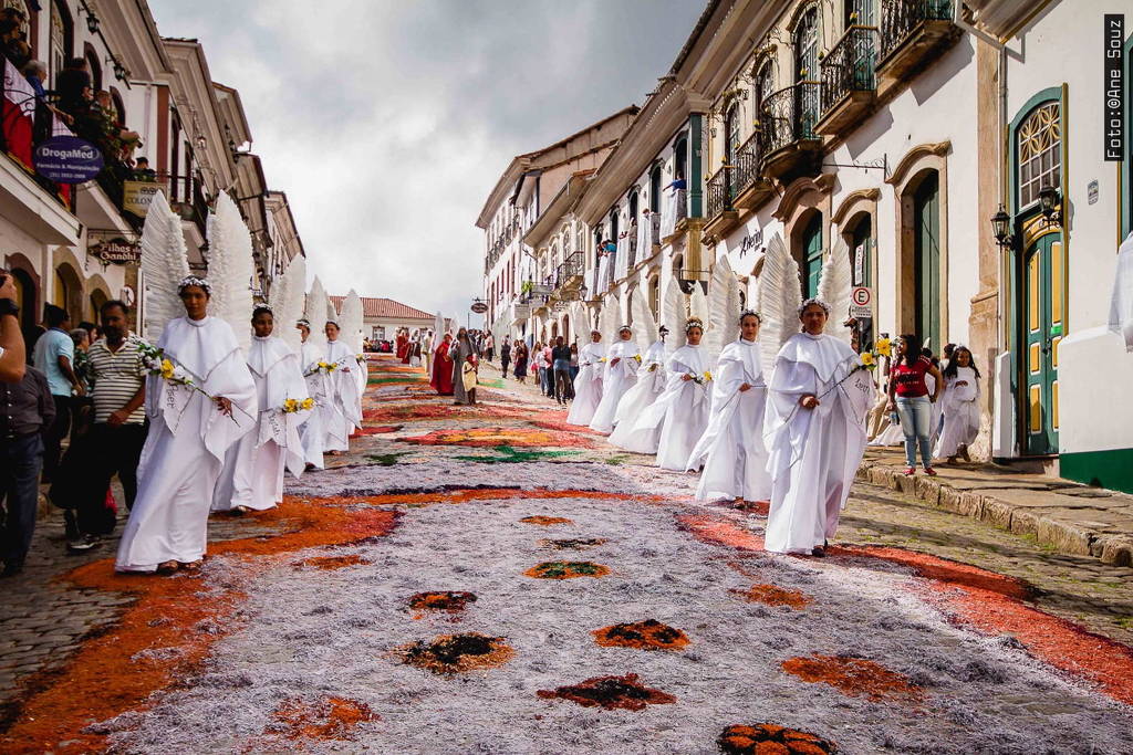 Em Ouro Preto, a confecção dos tapetes de serragem é um dos pontos altos da festa, juntamente com música sacra e encenações nas escadarias das igrejas centenárias. A cidade vizinha, Mariana, também conta com celebrações, como as que ocorrem na Catedral da Sé, que volta a receber eventos após oito anos de reforma.
