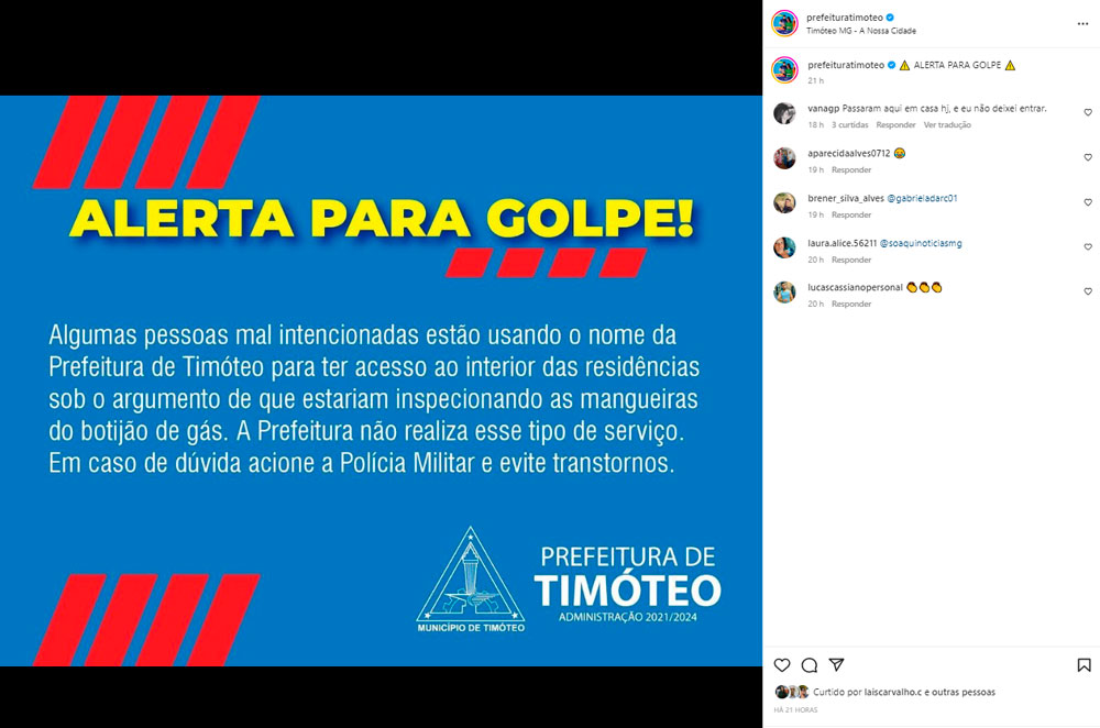 “Algumas pessoas mal intencionadas estão usando o nome da Prefeitura de Timóteo para ter acesso ao Interior das residências sob o argumento de que estariam inspecionando as mangueiras do botijão de gás. A Prefeitura não realiza esse tipo de serviço. Em caso de dúvida, acione a Polícia Militar e evite transtornos”.