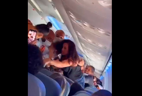 Nas imagens é possível ver que os comissários de voo tentaram controlar as pessoas envolvidas na confusão e, outros passageiros, tentaram ajudar.