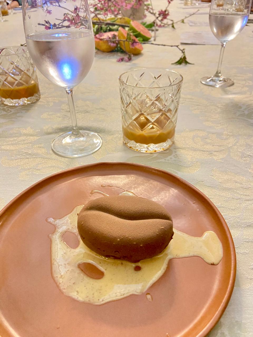 “Entremet de café com leite”. A sobremesa de origem francesa servida com os sabores mineiros: o nosso café com leite. Para acompanhar: licor de doce de leite.