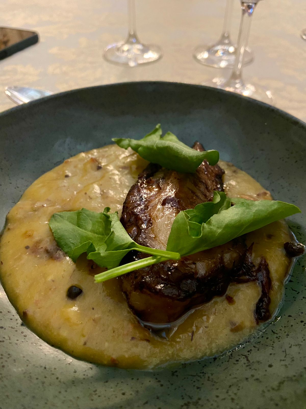 O conhecido caldo “Vaca atolada” ganhou ares sofisticados na servido com costela de ancho, azedinho e musseline de baroa.
