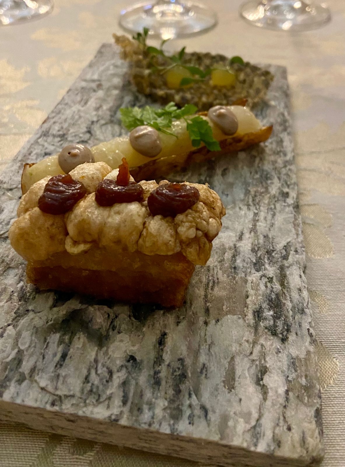 O serviço do jantar foi aberto com com o trio de pururucas, apresentadas de três formas diferentes: torresmo de barriga com creme de pé de moleque e dedo de moça; falsa pele de frango com tartare de cavaquinha e fígado de galinha; e pele de peixe com gel de limão capeta e coentro.