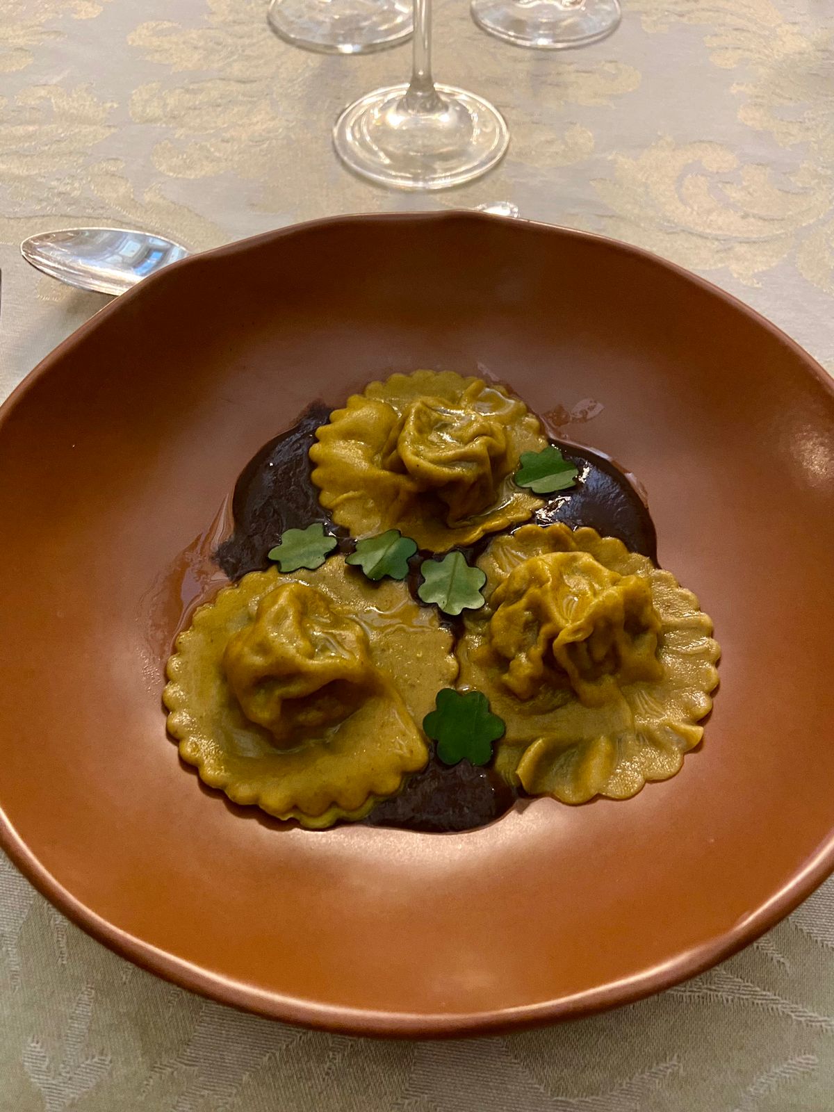 Da inspiração das cozinhas mineira e italiana nasceu a o primeiro prato que tem como base a tradicional galinha ao molho parto: “Ravioli de frango ao molho pardo, ora-pro-nobis e açafrão da terra”.