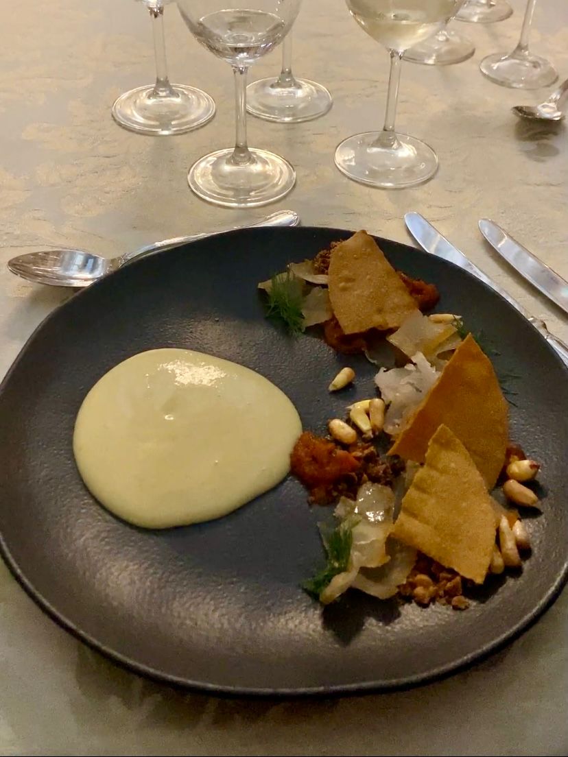 A entrada do jantar, de fato, foi prato com uma explosão de sabores à primeira garfada com a combinação de “Vinagrete de surubim curado, creme de milho verde, peruá de milho, crocante de fubá de milho criolo, farofinha de baru”.