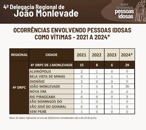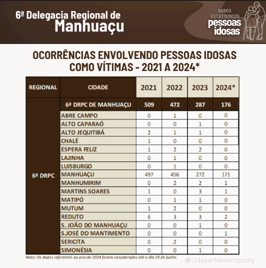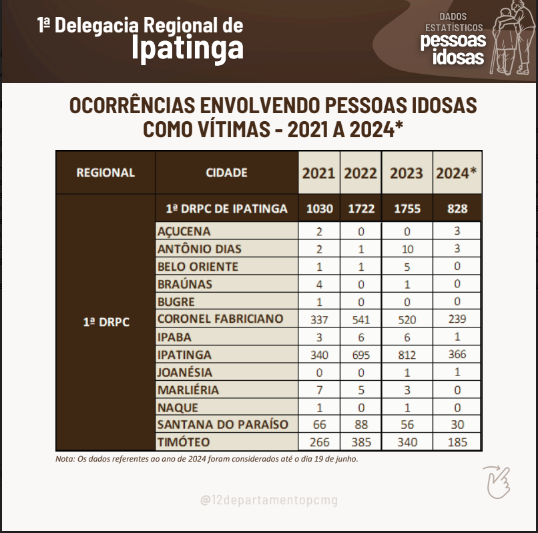 Na tarde desta quarta-feira (03), o 12º Departamento de Polícia Civil de Ipatinga apresentou as estatísticas das ocorrências envolvendo pessoas idosas. O Delegado Gilmaro Alves esclareceu que os números abrangem todos os casos em que pessoas acima de 60 anos são vítimas, e não apenas os crimes previstos no Estatuto do Idoso.