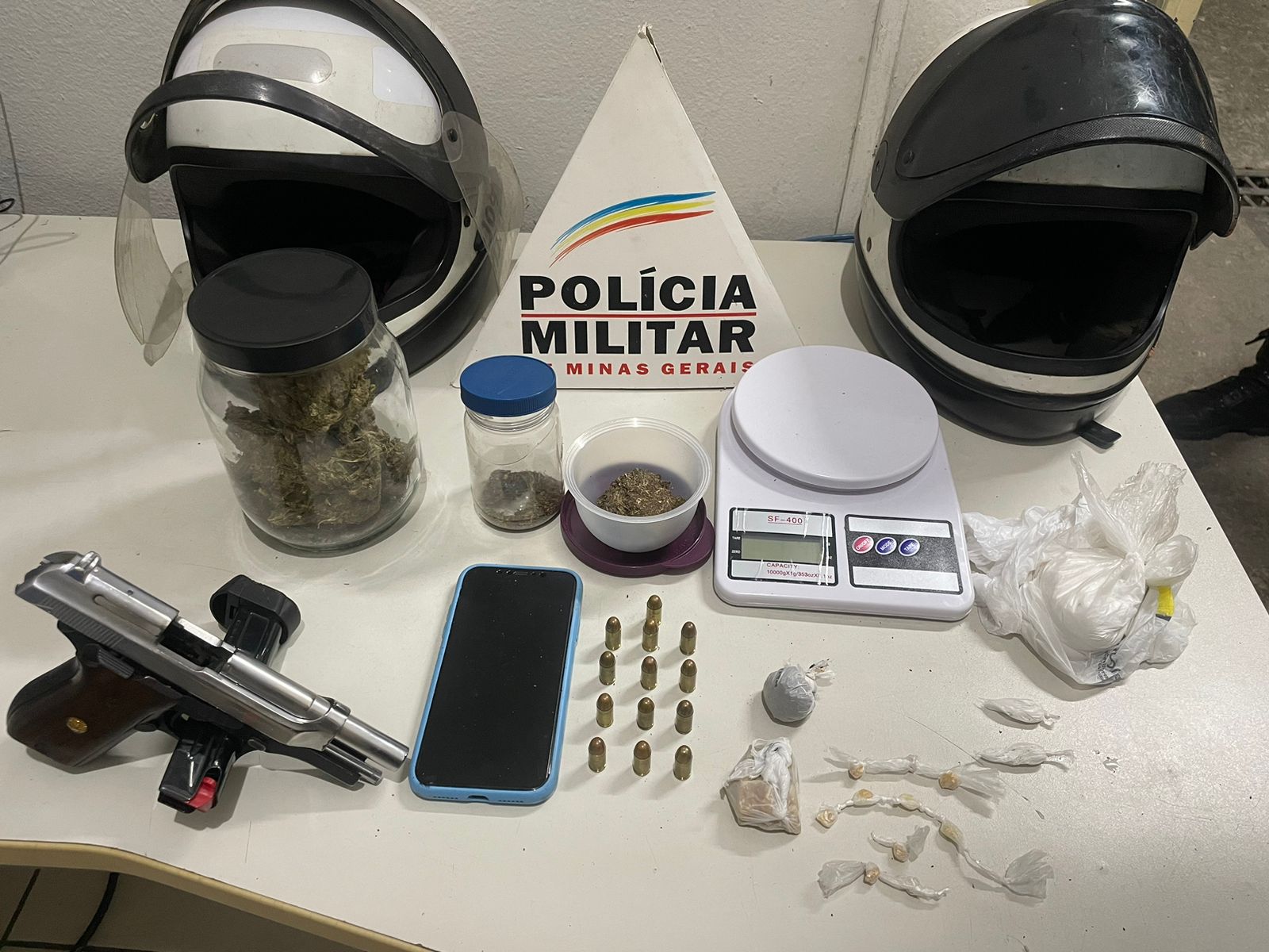 Com eles foram apreendidos 13 munições calibre 380, 10 pedras de crack, três potes de maconha, uma bucha de maconha, dois papelotes de cocaína, uma porção de cocaína, um carregador de pistola 380 e uma pistola Taurus calibre 380.