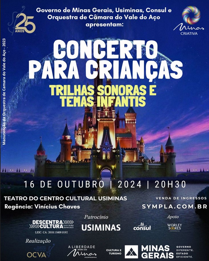 A Orquestra de Câmara do Vale do Aço (OCVA) prepara um espetáculo dedicado ao público infantil no dia 16 de outubro de 2024. Sob a batuta do maestro Vinícius Saturnino Chaves, a orquestra interpretará trilhas sonoras de filmes populares entre as crianças, como Moana, Aladdin, Rei Leão, Divertidamente, Meu malvado favorito, Kung Fu Panda, Transformers e outras músicas que prometem encantar e emocionar tanto os pequenos quanto seus acompanhantes.