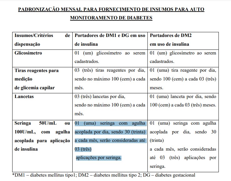 No município, há pacientes que necessitam de insulina mais de uma vez por dia, sendo permitido o uso individual em até três aplicações por seringa com agulha, conforme consta na Deliberação.
