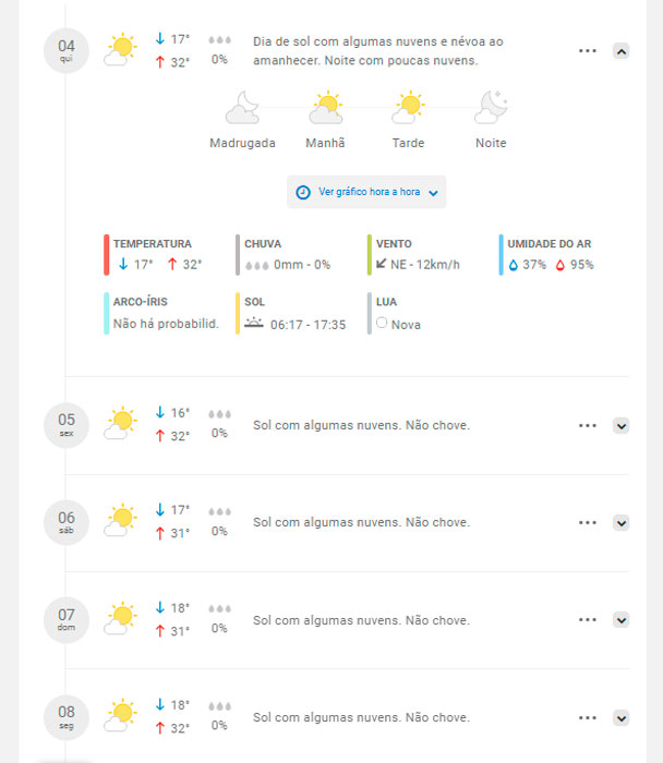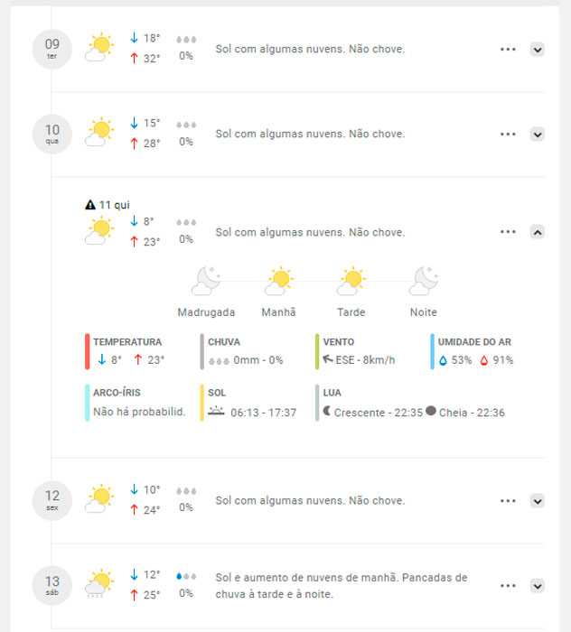 As temperaturas mais amenas, variando entre 8ºC e 25ºC devem ficar entre os dias 10 e 17, como aponta a previsão. Além disso, a previsão não aponta chuva na próxima semana, apenas no dia 16.
