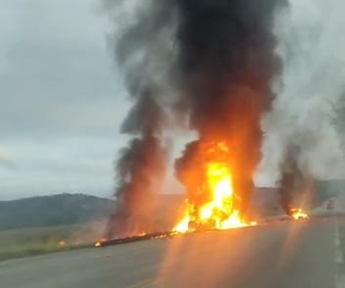 Um vídeo, que circula em grupos de WhatsApp, mostra os veículos em chamas na rodovia. Veja:
