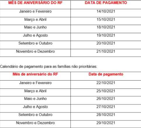 Terão prioridade para receber o auxílio as famílias que não têm o benefício do programa Bolsa Família e as famílias constituídas por mães solteiras e seus filhos. Para este grupo, o dinheiro será depositado no período de 14 a 21 de outubro de 2021. Para as demais famílias, o recurso será depositado de 22 a 29 também deste mês.
