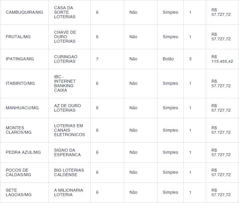 Outros oito mineiros também ganharam na Quina e receberam o prêmio de R$ 57.727,72. O valor é menor, pois fizeram uma aposta simples. Eles são das cidades de: Imperatriz, Cambuquira, Frutal, Itabirito, Manhuaçu, Montes Claros, Pedra Azul, Poços de Caldas e Sete Lagoas.
