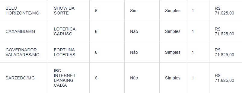 Uma aposta feita em Governador Valadares, no Leste de Minas Gerais, ganhou mais de R$ 70 mil na loteria. O sorteio do concurso 2433 ocorreu na noite da última quarta-feira (1) no Espaço Loterias Caixa, localizado o Terminal Rodoviário Tietê, na cidade de São Paulo.