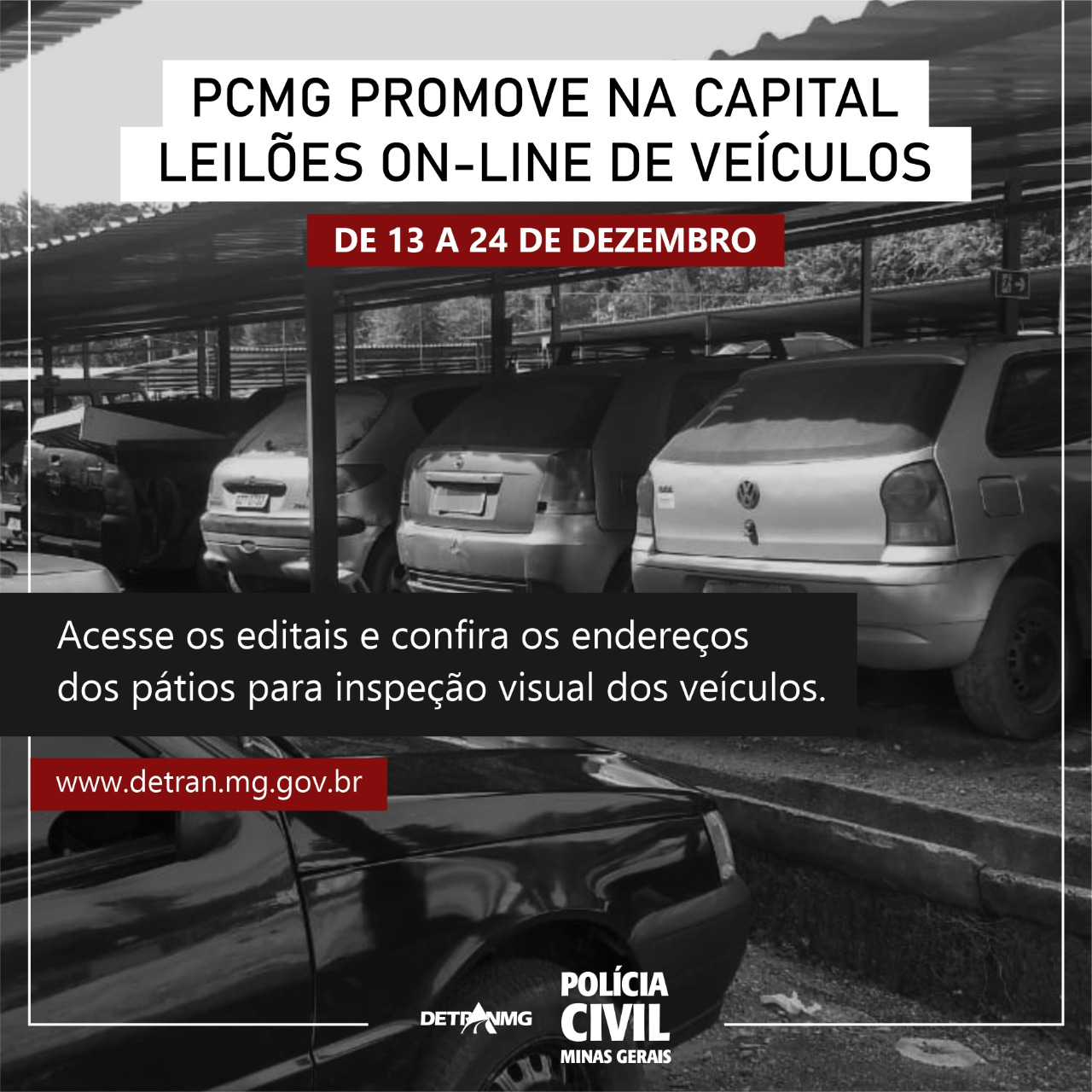 A Polícia Civil de Minas Gerais (PCMG) promoverá no período dos dias 13 a 24 de dezembro, seis leilões de veículos on-line. Serão disponibilizados automóveis e motocicletas recolhidos nos pátios credenciados pelo Departamento de Trânsito de Minas Gerais (Detran-MG), na capital.