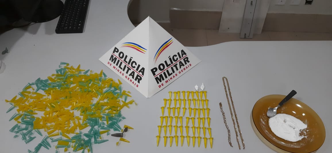 Foi apreendida uma porção de cocaína, 59 pinos com a droga, dois papelotes, mais de 300 pinos vazios, uma pulseira e um cordão.