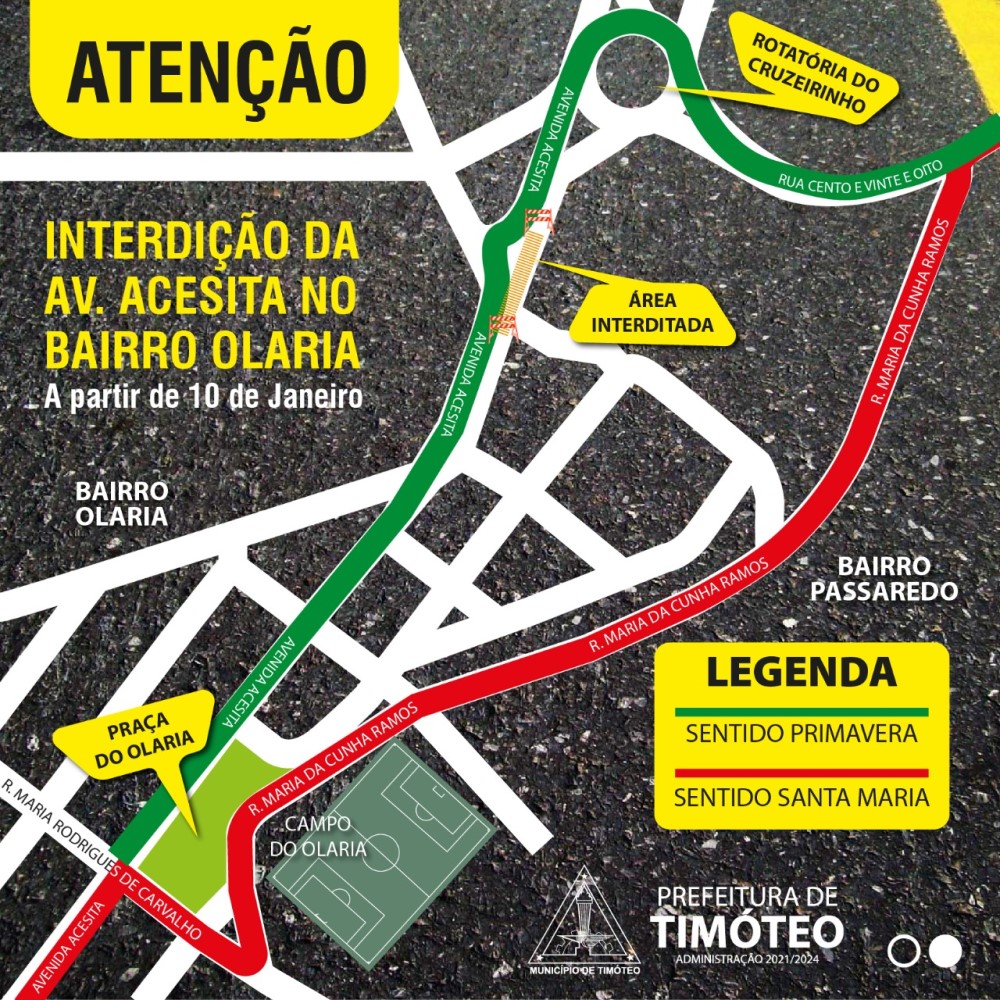 A partir do dia 10 de janeiro um trecho de aproximadamente dez metros da Avenida Acesita, próximo ao trevo do Bairro Olaria em direção aos Bairros Quitandinha e Santa Maria, será interditado para a realização de serviços de infraestrutura, visto que o local mencionado registra uma pequena depressão.
