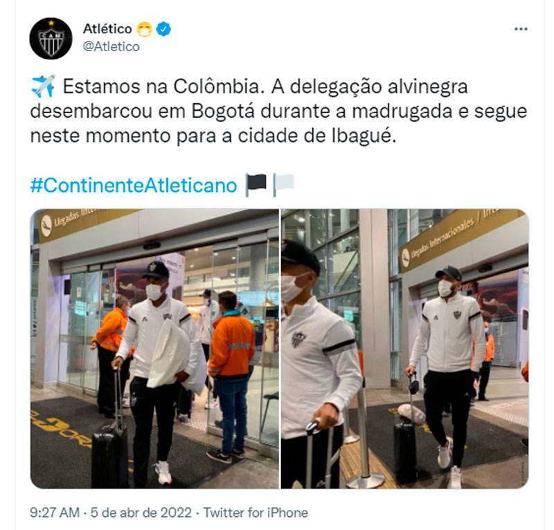 Em seu perfil oficial no twitter, o Galo afirmou que já está em solo colombiano. “Estamos na Colômbia. A delegação alvinegra desembarcou em Bogotá durante a madrugada e segue neste momento para a cidade de Ibagué.
