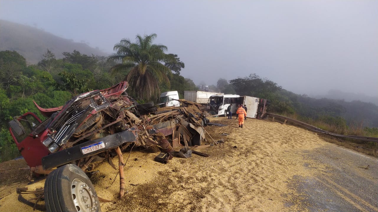De acordo com relatos iniciais, a carreta bitrem teria tombado na via. Logo em seguida, um caminhão também tombou, colidindo com um micro-ônibus que transportava funcionários da saúde de Itutinga. Um carro também se envolveu no sinistro.