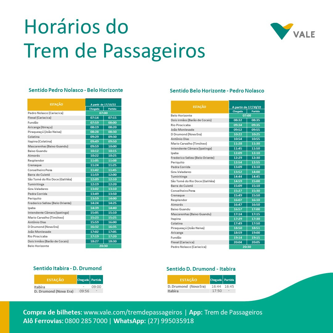 Segundo a Vale, a partir de 20 de outubro, a saída de Belo Horizonte-MG passará a ser às 7h, com chegada em Cariacica-ES prevista para às 20h30. No sentido inverso, a partida permanece às 7h, com desembarque em Belo Horizonte também previsto para às 20h30.