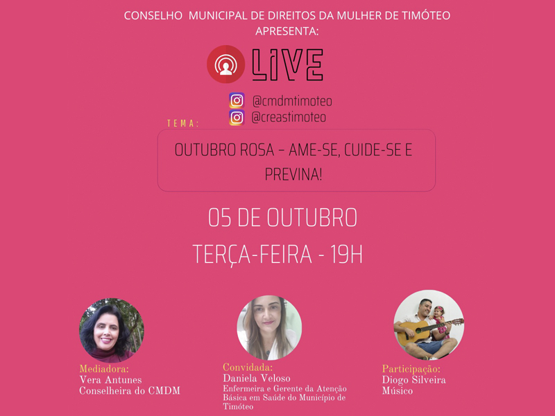 O Conselho Municipal dos Direitos da Mulher de Timóteo realiza nesta terça-feira (05/10), às 19h, uma transmissão ao vivo sobre o tema “Ame-se, Cuide-se e Previna”, em alusão à Campanha Outubro Rosa. As convidadas são Daniela Veloso, enfermeira e gerente de Atenção Básica do município, a conselheira Vera Antunes como mediadora e a atual presidente do CMDM, Patrícia Soares. Participação especial do músico Diogo Silveira.