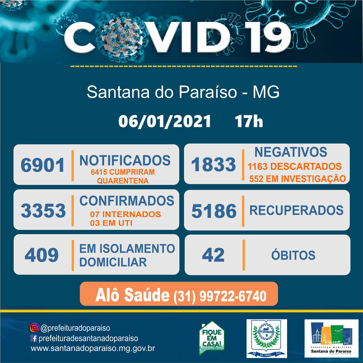 Nesta quarta-feira (6), a Secretaria Municipal de Saúde de Santana do Paraíso divulgou que foram registrados mais dois óbitos em decorrência de complicações pela Covid-19. Com isso, o município registra, desde o início da pandemia, 42 óbitos.