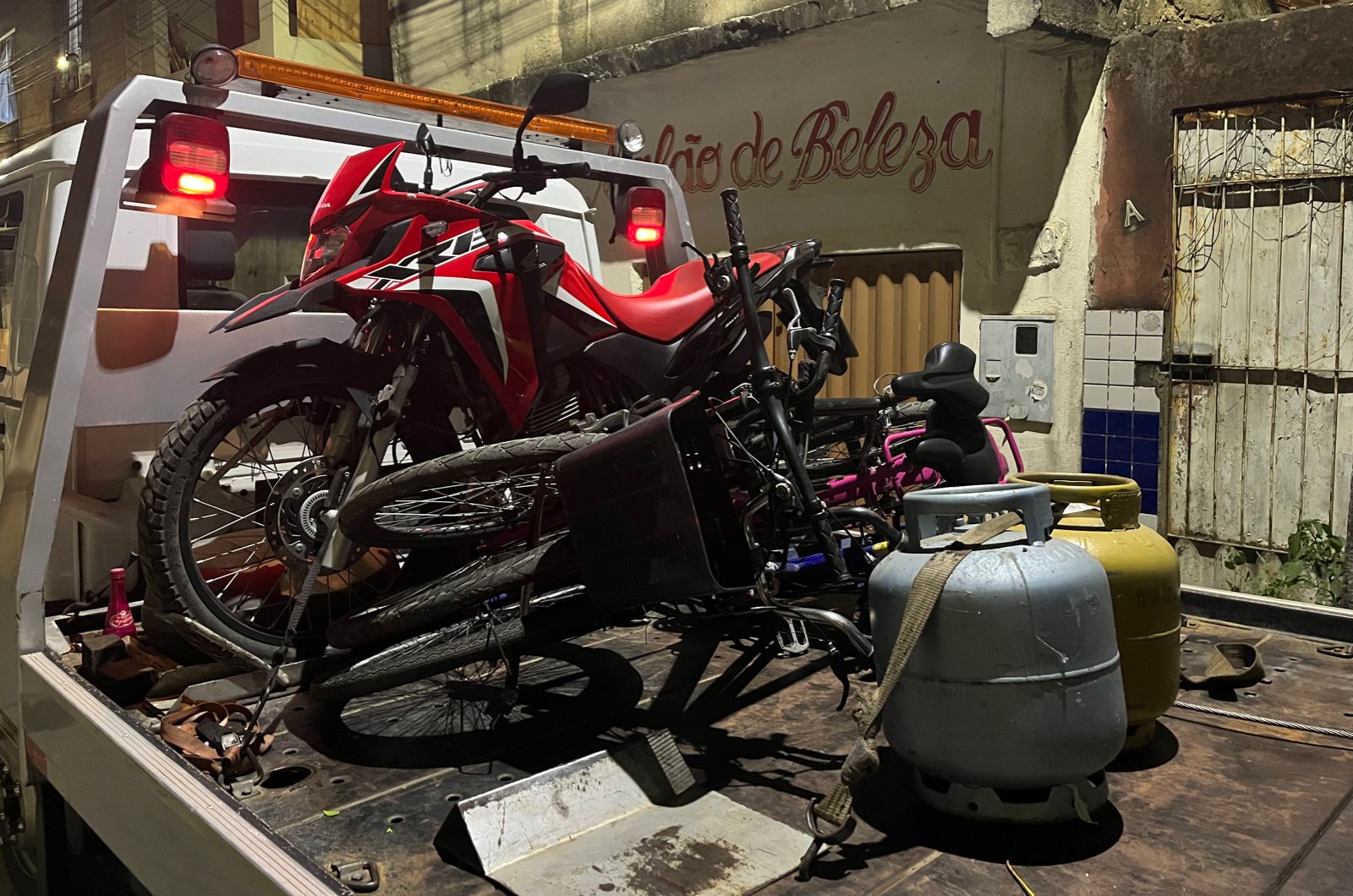 Conforme a PM, após buscas no local, foram encontrados: quatro barras, cinco porções e três buchas de maconha; oito papelotes de cocaína; uma pedra de crack; uma lâmina e um prato com resquícios de cocaína. Também foram apreendidos R$159,65 em espécie, três bicicletas, dois botijões de gás e uma motocicleta.