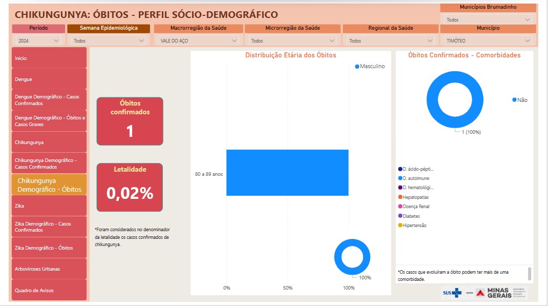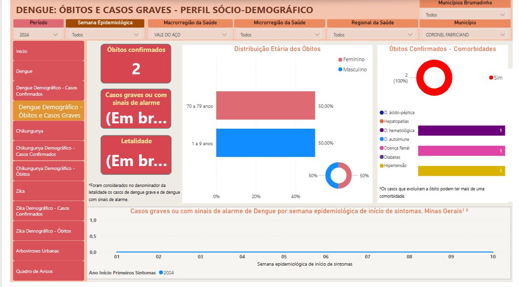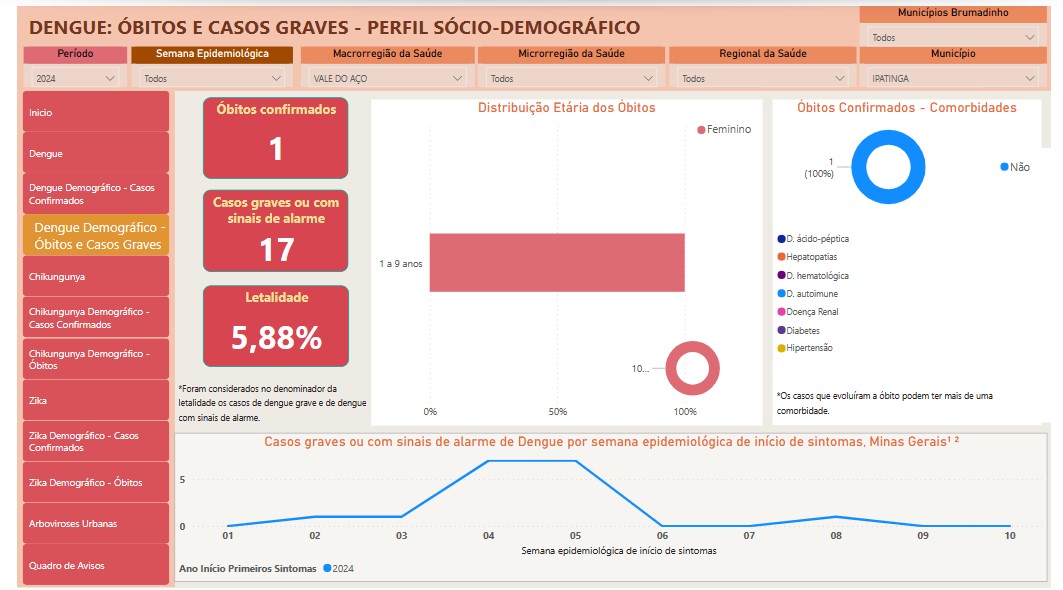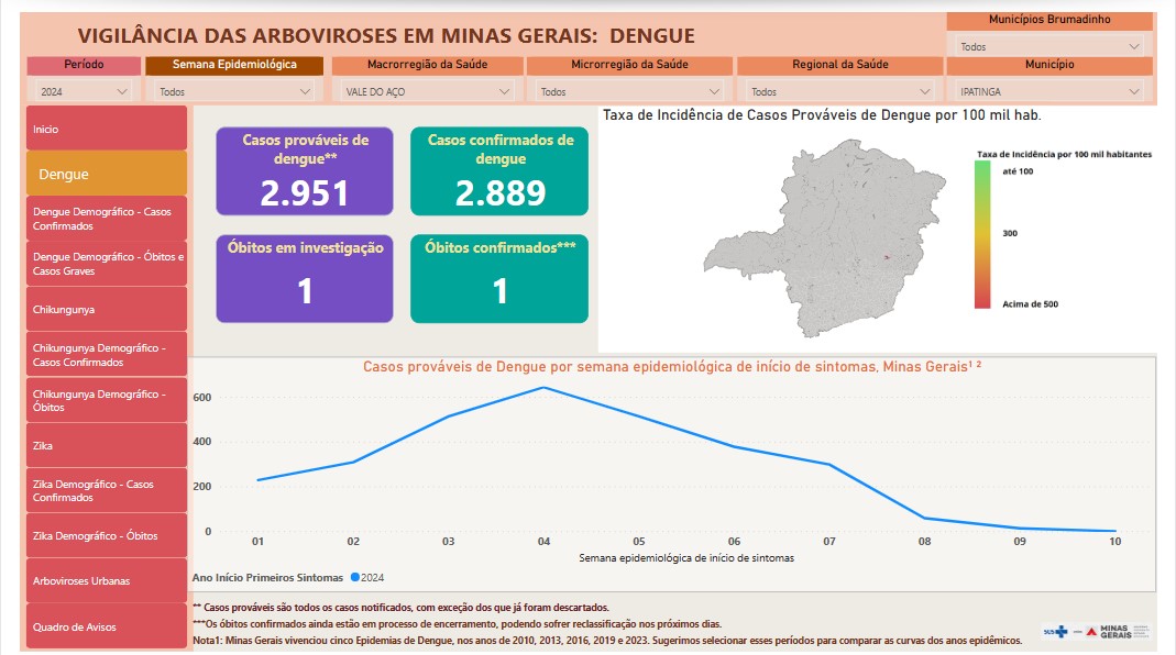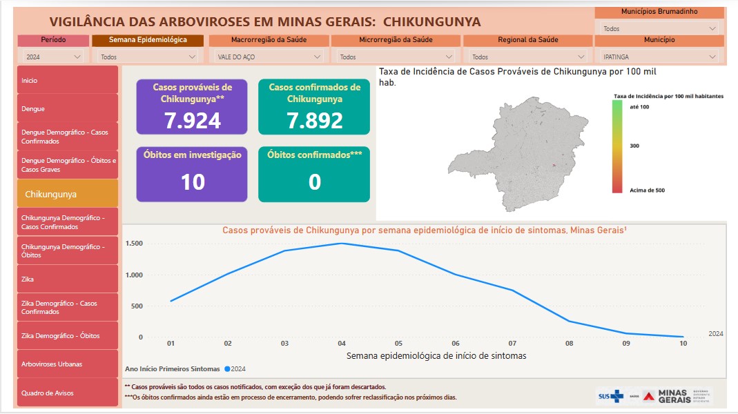 O painel também aponta que uma morte em investigação por dengue na cidade e 10 em que a causa pode ter sido  chikungunya. Além disso, existe 2.889 pessoas tiveram dengue este ano em Ipatinga e 7.892, chikungunya. E ainda 17 casos graves ou com sinais de alarme.