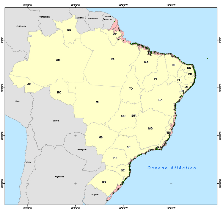 O IBGE também atualizou a lista de municípios defrontantes com o mar. Com 10,9 mil km de litoral, o país tem 279 municípios em 17 estados nessa condição, mais a Lagoa dos Patos, no Rio Grande do Sul. Isso representa uma superfície aproximada de 251,3 mil km², correspondente a cerca de 2,9% do território brasileiro. A atualização identifica ainda as coordenadas das concentrações urbanas (sedes municipais) e a área territorial de cada um dos municípios.
