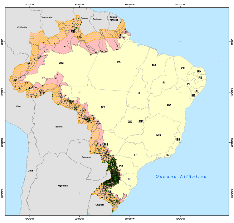 Não houve mudança em relação às grandes regiões geográficas e unidades da federação, nem na linha de fronteira, responsabilidade das Comissões Brasileiras Demarcadoras de Limites, do Ministério das Relações Exteriores. Três grandes regiões têm áreas de fronteira, sendo a maior o Norte, que corresponde a cerca de dois terços de toda a extensão fronteiriça nacional. Entretanto, é o Sul a região com maior quantidade de municípios na faixa de fronteira (418), sendo 196 no Rio Grande do Sul, 139 no Paraná e 83 em Santa Catarina. Completa a lista o Centro-Oeste, onde a maior área de fronteira fica no estado do Mato Grosso do Sul.