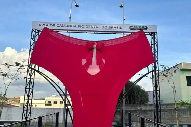 Conhecida como a Capital da Lingerie, a cidade de Juruaia, em Minas Gerais, acrescentou mais um título ao seu nome: agora é o lar da maior calcinha fio dental do Brasil. A peça, que será exibida na praça Maria Regina Ribeiro do Valle Tomaz, tem dimensões surpreendentes: cinco metros de altura e seis de largura.