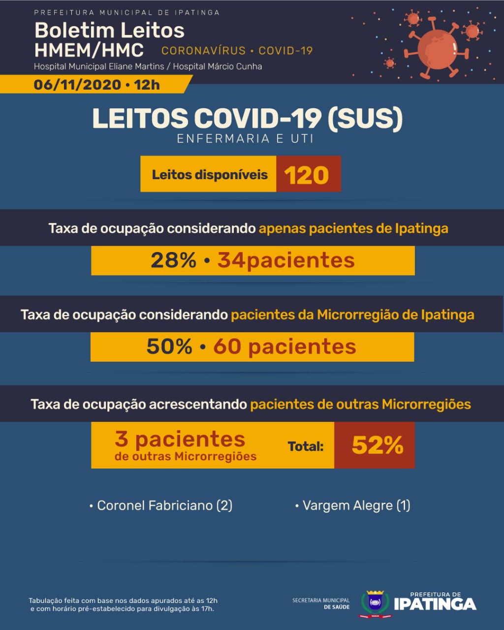 A Prefeitura de Ipatinga confirmou, nesta sexta-feira (6), por meio da Secretaria de Saúde, mais um óbito decorrente de complicações por Covid-19. Trata-se de um homem de 74 anos, do Vale do Sol, que estava internado no Hospital Márcio Cunha (HMC). O paciente atestou positivo para a Covid-19.