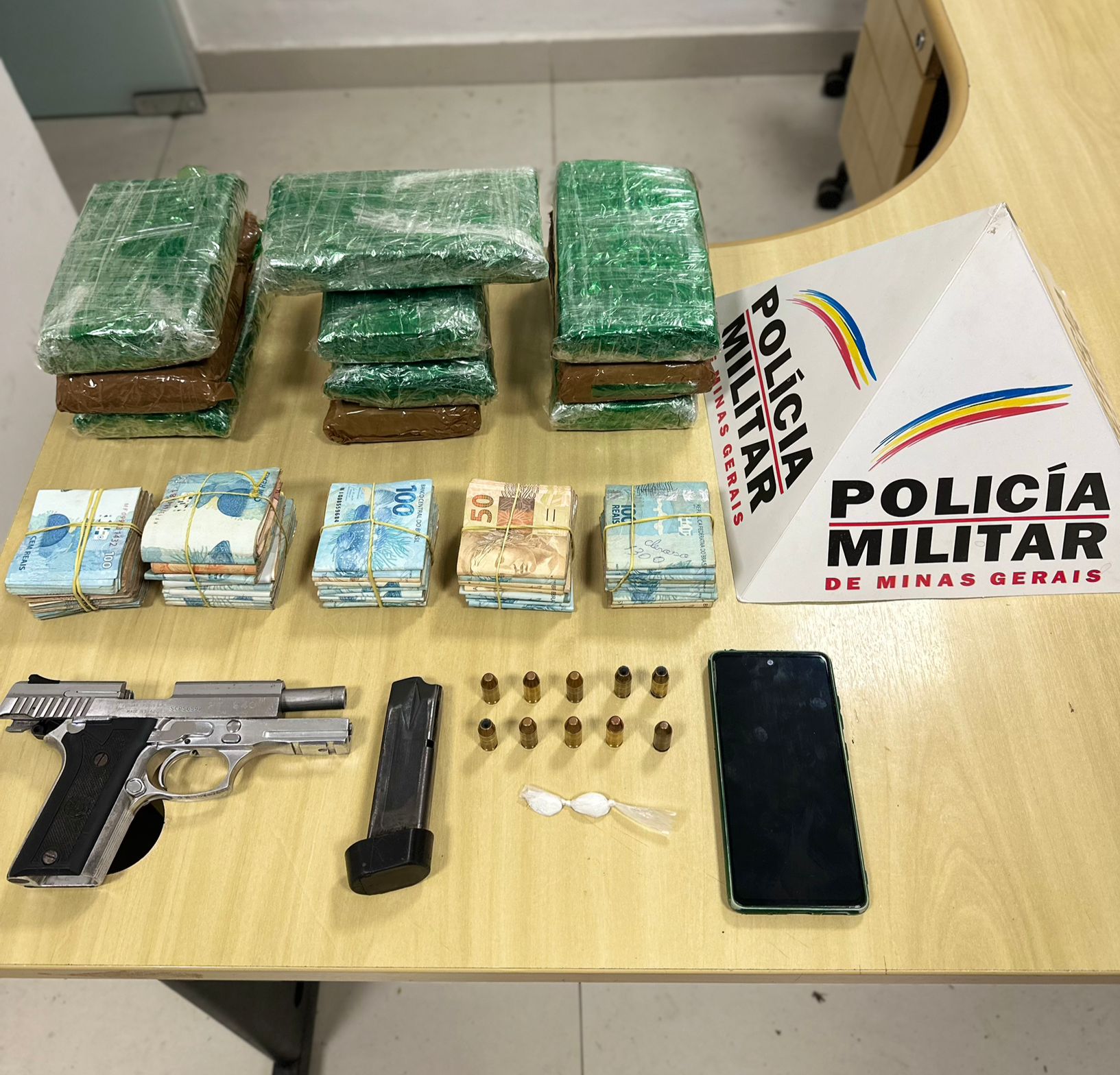 Entre os itens apreendidos, estavam uma pistola Taurus calibre .40, um carregador para a mesma arma, dez cartuchos calibre .40, além de substâncias ilícitas, incluindo dez barras de crack e dois papelotes de cocaína. As autoridades também apreenderam R$ 50.019,00 em dinheiro e o veículo utilizado pelo suspeito, que foi levado ao pátio para as devidas providências.