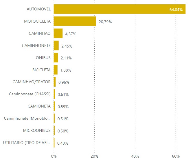 Os veículos mais envolvidos em acidentes foram automóveis (64,84%), seguidos por motocicletas (20,79%) e caminhões (4,37%). Interessantemente, os veículos de aprendizagem tiveram um baixo índice de acidentes, com apenas sete casos reportados durante o ano. Veículos alugados também tiveram participação significativa, com 3,98% dos acidentes.