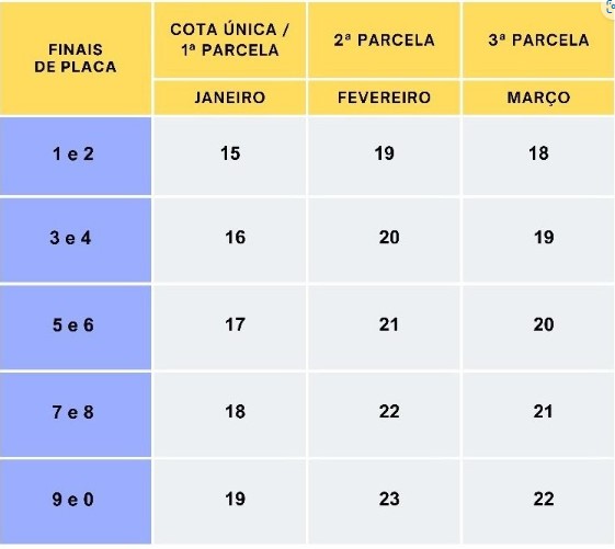 A tabela com os prazos de pagamento da primeira parcela ou cota única do IPVA 2024 foi divulgada pelo governo estadual. Começa em 15 de janeiro para veículos com finais de placa 1 e 2, vai até 19 de janeiro, para veículos com finais de placas 9 e 0. No pagamento em cota única é concedido o desconto de 3%. Veja os detalhes!