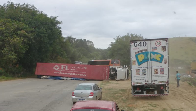 Por conta do acidente, a carreta ficou atravessada na pista e o trânsito foi paralisado no local