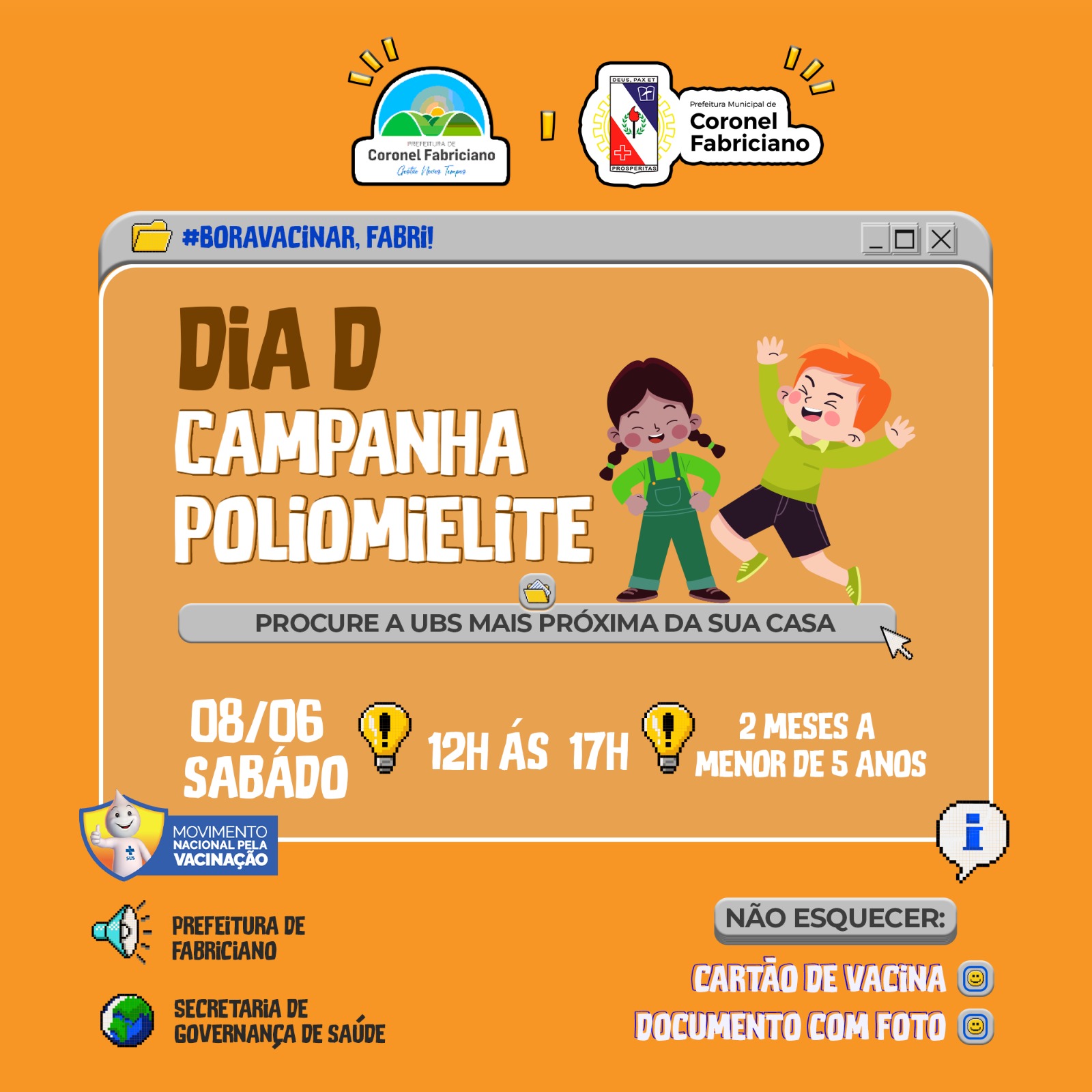 A Prefeitura de Timóteo, por meio da Secretaria de Saúde e Qualidade de Vida, promoverá o “Dia D” da Campanha de Vacinação contra Poliomielite no próximo sábado (08), nas unidades básicas de saúde com sala de vacinação. Dez UBS e o Centro de Saúde João Otávio, no bairro Olaria, funcionarão no horário de 9h às 15h no “Dia D”. A vacina é a única forma de prevenção contra a poliomielite. Em Timóteo, a meta é vacinar 95% do público-alvo estimado em 4617 crianças.