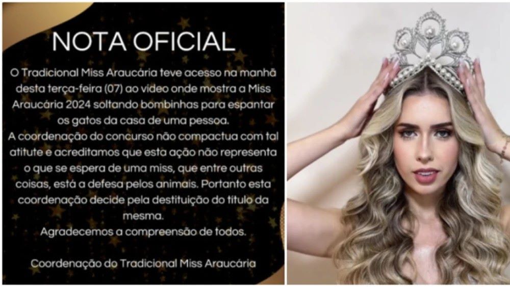 Gabrielly Vitória, que detinha o título de Miss Araucária 2024, foi destituída nesta terça-feira (7) após a ampla repercussão de um vídeo em que aparece soltando bombinhas para espantar gatos. A gravação, que viralizou nas redes sociais, gerou indignação e levantou acusações de maus-tratos aos animais. Gabrielly nega as acusações e alega que o vídeo foi editado para descontextualizar os fatos.