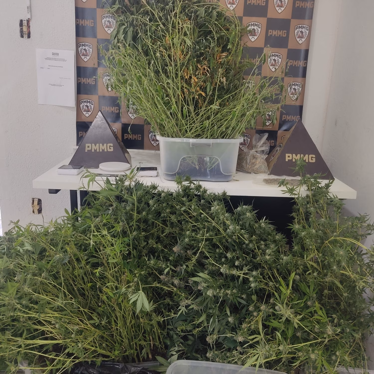 No interior do imóvel, os militares encontraram plantas em diferentes estágios de desenvolvimento. Algumas estavam próximas do ponto de colheita, com flores em formação, enquanto outras ainda eram mudas ou pés de menor porte, indicando uma produção escalonada para abastecimento contínuo.