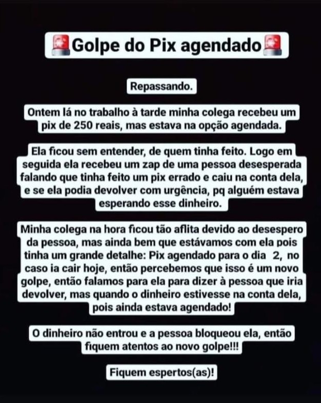À medida que a população vai conhecendo os golpes aplicados pelos estelionatários, os golpistas vão se reinventando para criar novas formas de ludibriar possíveis vítimas. Segundo mensagens que circulam nas redes sociais, o novo golpe que estaria sendo aplicado, ou pelo menos tentado, é o “Pix Agendado”,
