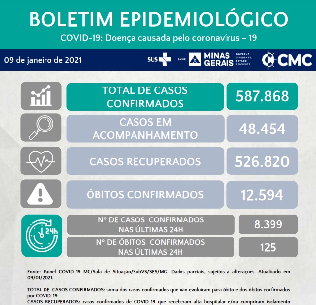 Minas confirmou neste sábado (9), através do boletim epidemiológico divulgado pelo governo estadual, 8.399 casos de covid-19 e 125 óbitos em decorrência da doença em 24 horas. Anteriormente o recorde de casos confirmados em 24 horas no Estado era de 7.715 infecções na última quarta-feira (6).