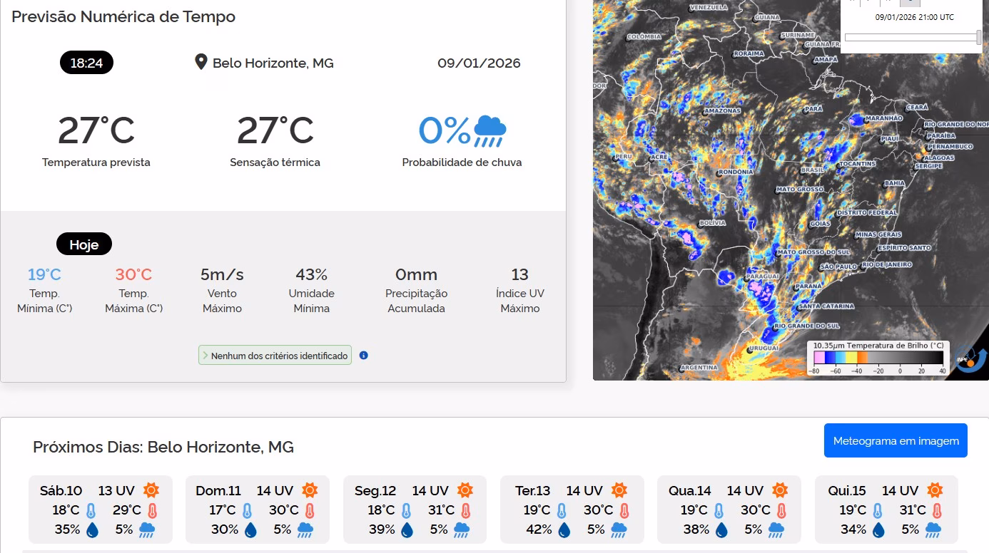 No sábado, o tempo permanece predominantemente estável em Minas Gerais, porém ainda há possibilidade de tempestades isoladas, principalmente durante a madrugada no Triângulo e nas regiões Sul e Sudoeste.