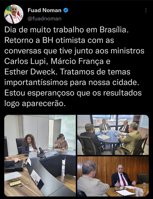“Dia de muito trabalho em Brasília. Retorno a BH otimista com as conversas que tive junto aos ministros Carlos Lupi, Márcio França e Esther Dweck. Tratamos de temas importantíssimos para nossa cidade. Estou esperançoso que os resultados logo aparecerão.” Escreveu Noman.