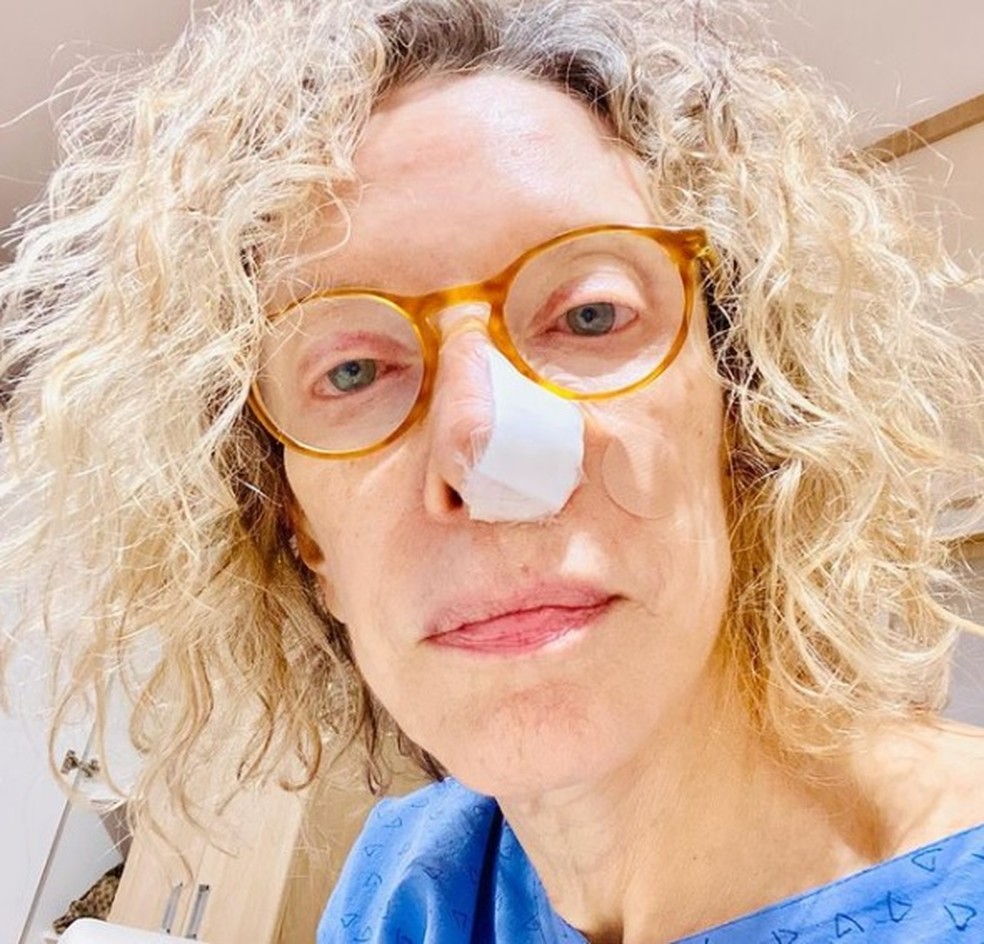 “Meu Dia Internacional da Mulher! Deu-se que passando pela @clinicaotaviomacedo , com uma espinha que apareceu na minha narina esquerda e não saía mais, meu querido dr. Otávio 🙏🏻 não gostou do que viu e me mandou para exames aprofundados que resultaram, uma semana e meia depois(hoje), numa cirurgia para retirada de um sorrateiro carcinoma basocelular 😱 Passei uma semana bem da estressante...até hoje. Recebi alta agora há pouco, tenho um chumaço me entupindo o nariz que deve ficar assim até a sexta-feira 😱 e, importante, um conselho a dar: usem protetor solar, de preferência até dentro de casa, sempre. Como disse meu cirurgião, dr. Luiz Roberto Terzian 🙏🏻quando argumentei que tomei sol pra valer e sem protetor “só” na adolescência: “Não importa, tomou sol uma vez, na idade que for, é pra sempre.” Anotado e passado pra frente. Obrigada e obrigada ao dr. Marcelo Pasquali 🙏🏻que me anestesiou uhuuuuuu... Beijos grogues, desta sempre sua, G..”