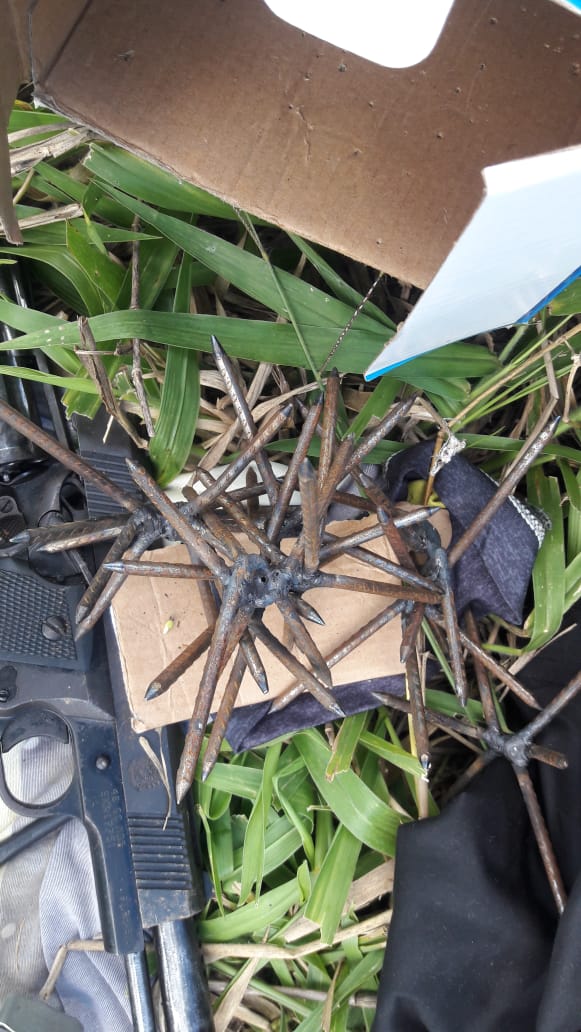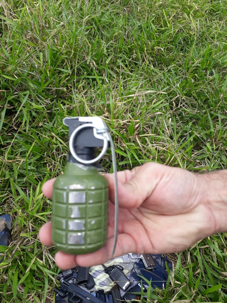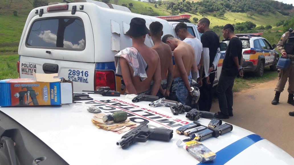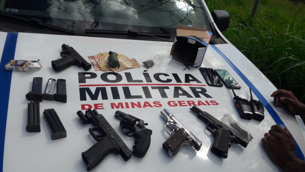 Entre os materiais apreendidos, estão cinco armas de fogo, uma granada, miguelitos e dinheiro, além de um veículo Ford Ka.